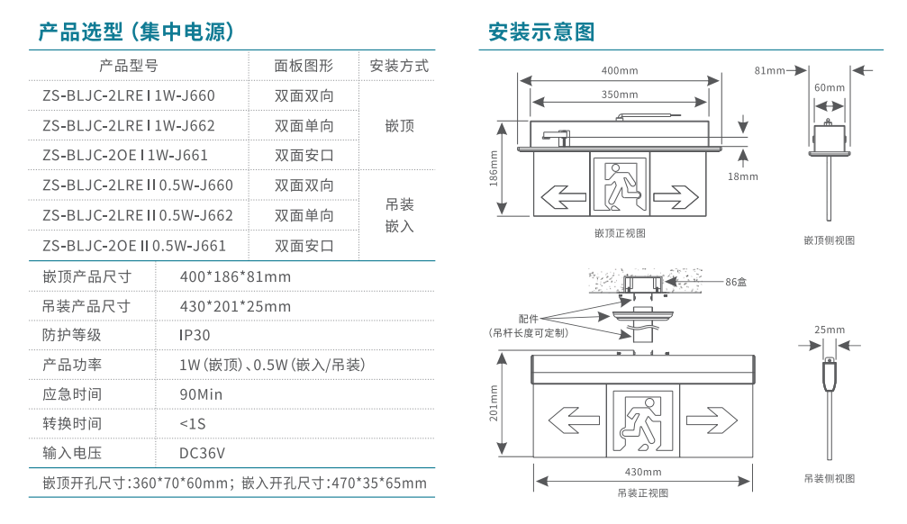 双面单向标志灯(水晶吊牌款)消防应急标志灯 | ZS-BLJC-2LRE I1W-J662 | 嵌装