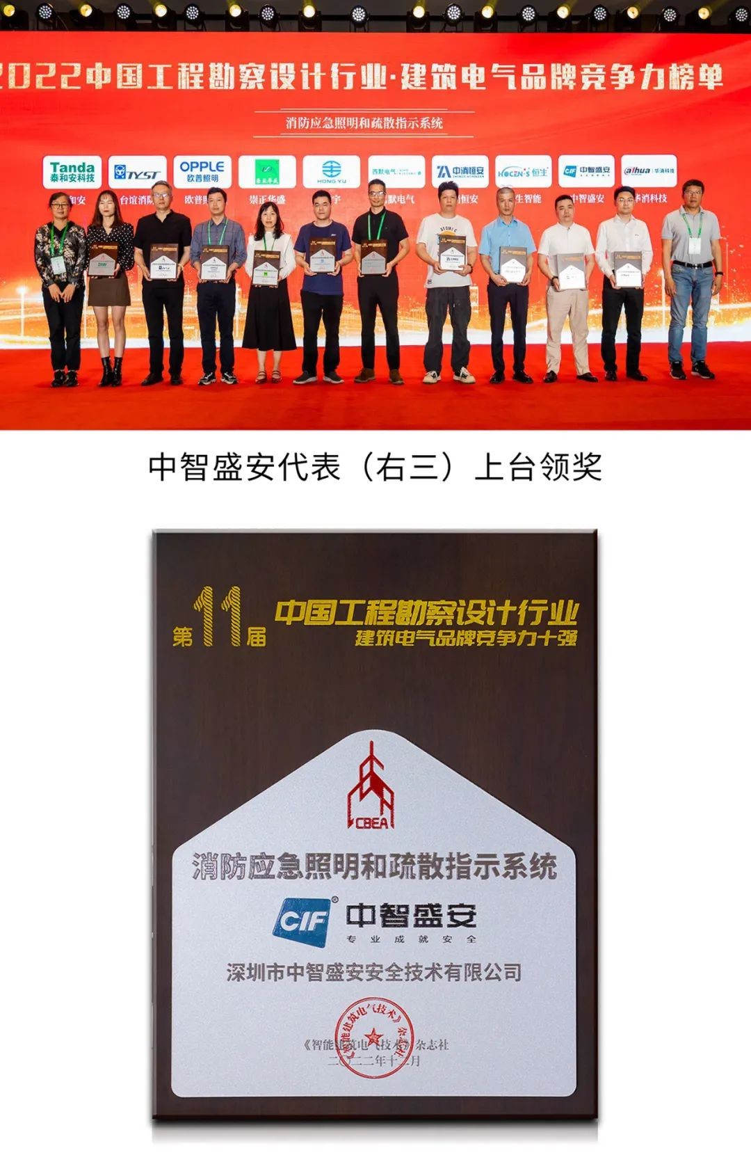 会上同期还举行《2022中国工程勘察设计行业·建筑电气品牌竞争力报告》发布仪式暨颁奖典礼。深圳市中智盛安安全技术有限公司(以下简称中智盛安)被评为消防应急照明和疏散指示系统竞争力十强企业。